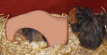 Ještě jedna drobná rada, postřeh. Morčátka se velmi ráda schovávají. Cítí se v bezpečí, potřebují své soukromí. Protože ale jak jsem už psala, domečky z karton.krabic u nich dlouho nevydrží, dřevo také ohlodávají, přišli jsme na to, že nejlepší způsob, jak jim umožnit se schovat a přitom na ně vidět ( protože koukat na "prázdnou klec" nikoho nebaví :-) jsou květináče ! Buď obyčejné hliněné větší, nebo hranaté a úplně nejlepší jsou takové ty ozdobné amforky, mají dva otvory, takže můžou prolézat, a nebo v ní být a cítit se krytí, i když jim z druhého otvoru čučí bříško °+) (viz. foto pod článkem :-) Opět nedoporučuji umělou hmotu, květináče z ní jsou sice levnější, ale neriskovala bych,- měla bych strach, že ji okoušou a pak umřou. Protože umělá hmota do morčecího bříška prostě nepatří !